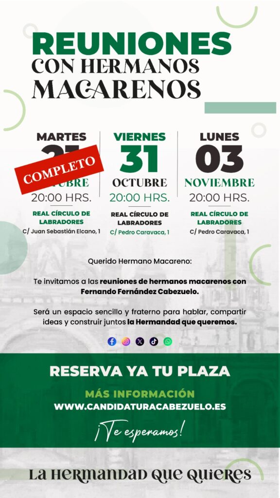 AGOTADAS las plazas reservadas para la reunión del 3 de noviembre ‼️ 🙏🏻 Agradecemos a los más de 550 hermanos/as que se han interesado y apuntado para participar en estas reuniones de macarenos. 👉🏻 Y a los más de 300 que por aforo no podrán asistir a estas citas les informamos que buscaremos nuevas fechas para retomar estos encuentros que consideramos tan necesarios para exponer nuestro proyecto y, sobre todo, para atender tantas inquietudes e ideas que nuestros hermanos tengan. Informaremos próximamente. Juntos lograremos #LaHermandadqueQuieres