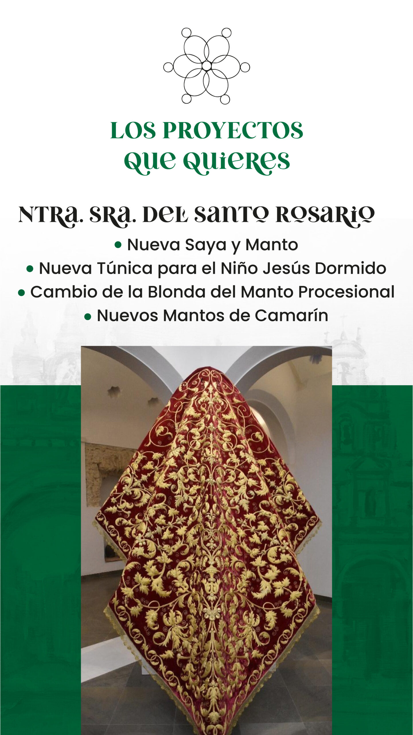 Con el objetivo de garantizar la óptima conservación y la autonomía patrimonial de ambas imágenes, la candidatura propone poner fin a la cesión de prendas y ampliar el ajuar de camarín de cada Titular. En el caso de Nuestra Señora del Santo Rosario, el nuevo terno se bordará sobre un soporte blanco con matiz melado, tonalidad inédita en la Hermandad, símbolo de pureza y virginidad mariana. El diseño incluirá una amplia guardilla o cenefa perimetral y un campo central decorado con motivos florales inspirados en la advocación del Rosario y en el barrio de la Macarena, de origen hortelano.