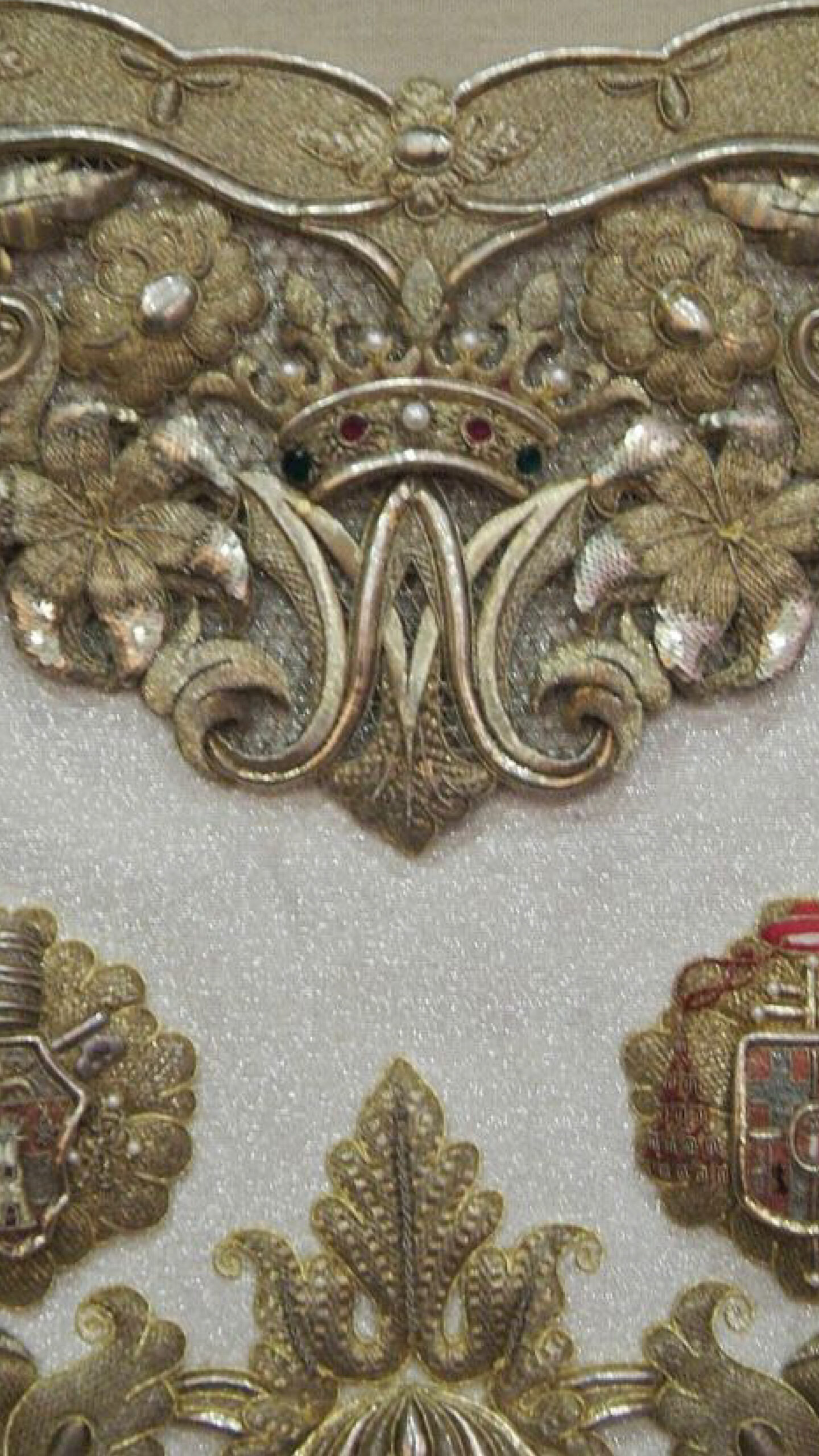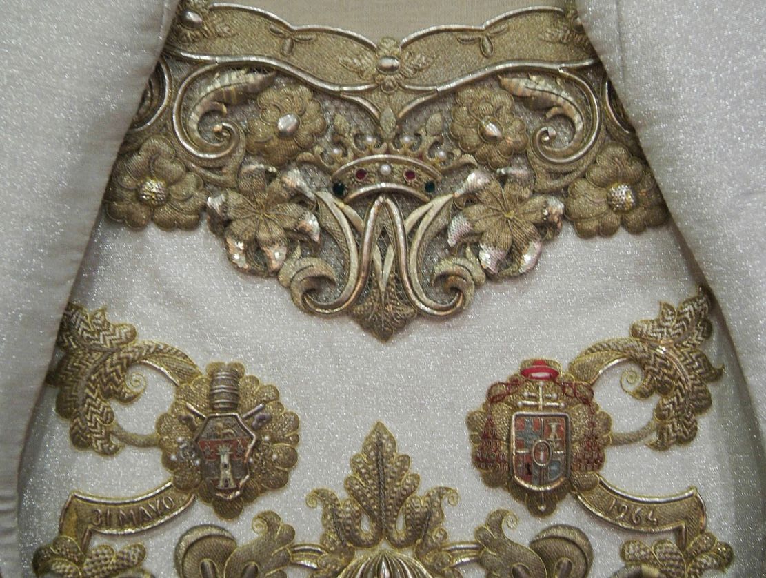 Detalle de la saya “de la Coronación” en la que se aprecian los escudos de Su Santidad el Papa Juan XXIII y del Cardenal Bueno Monreal; y las leyendas “31 mayo” y “1964”.