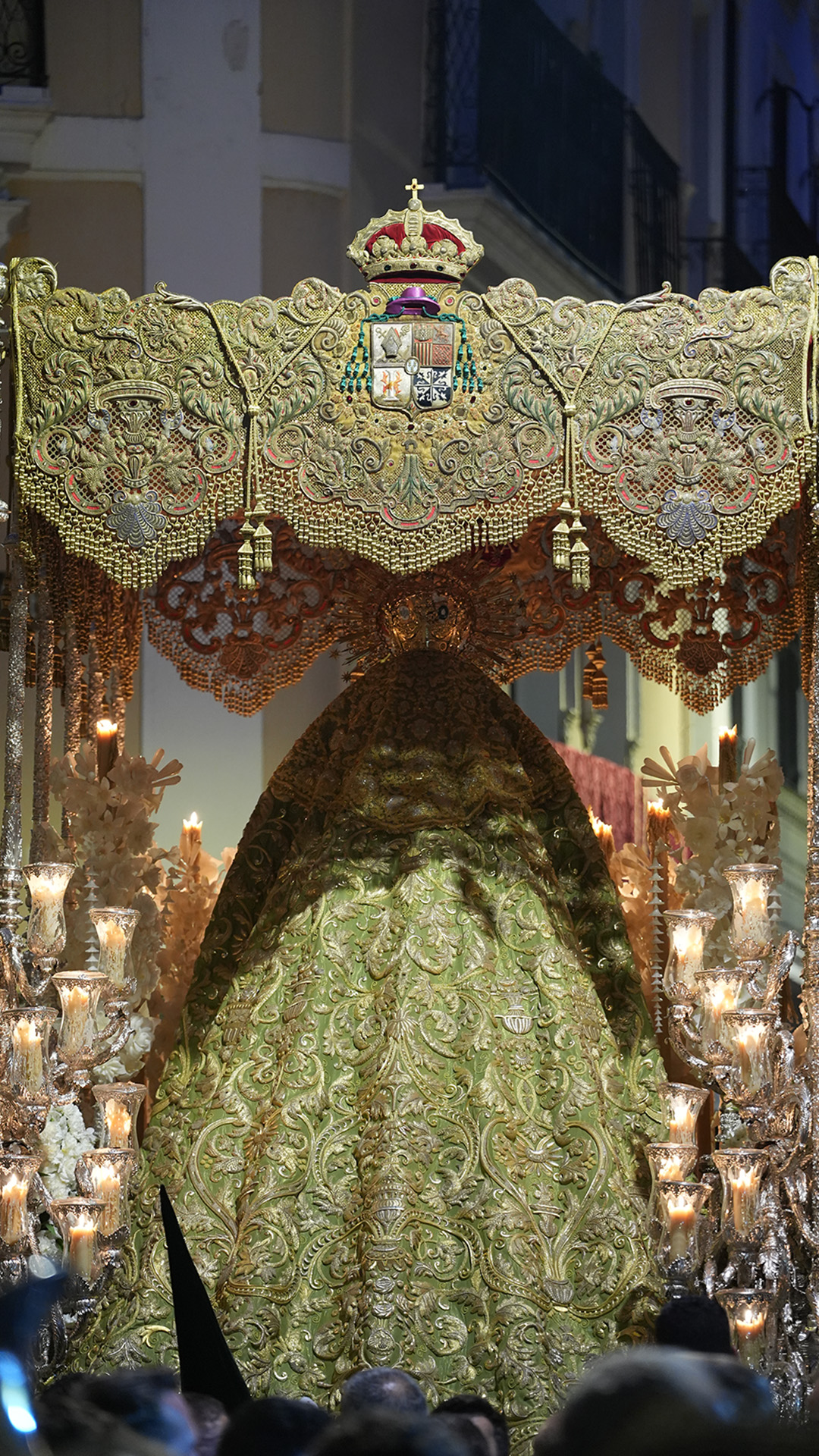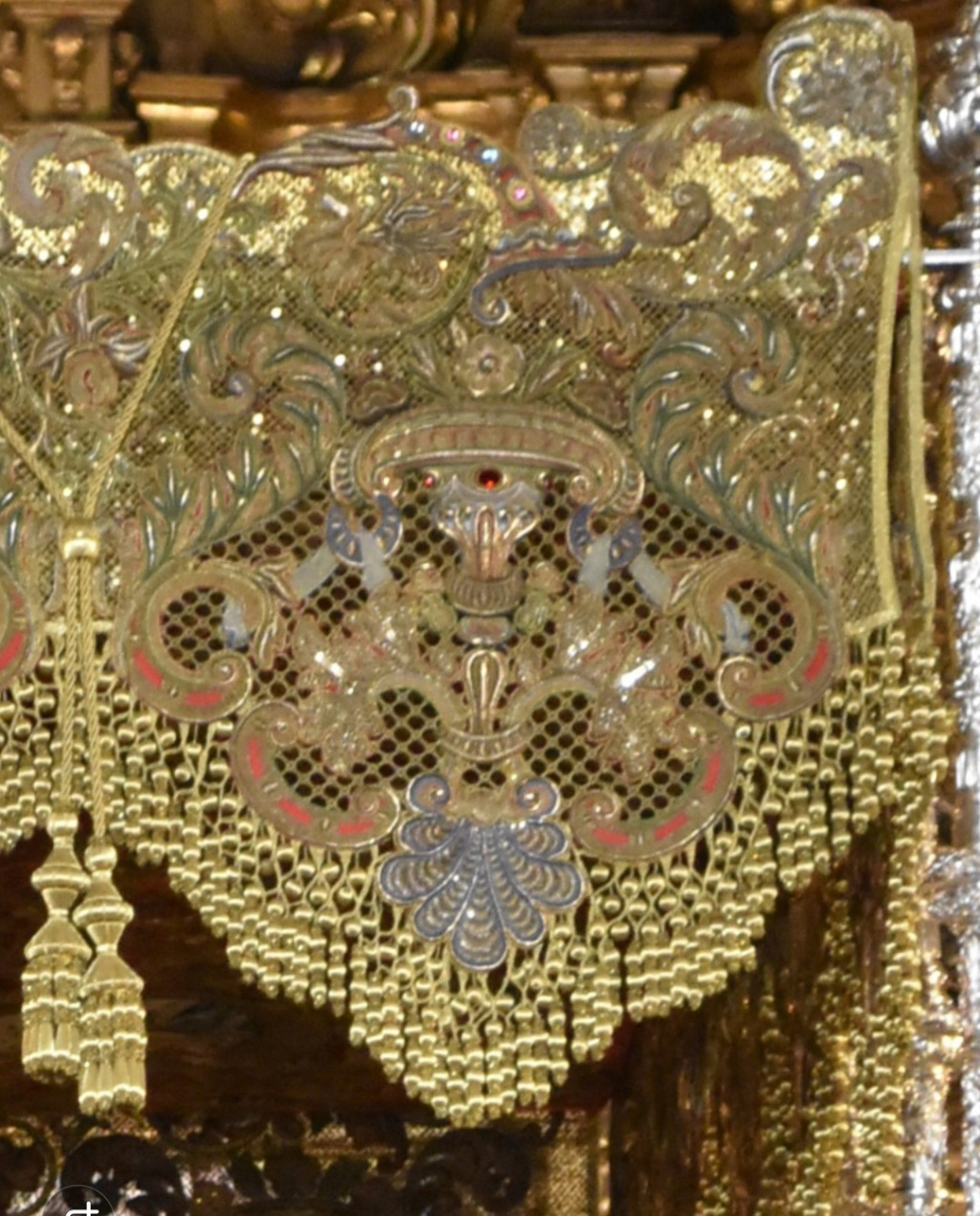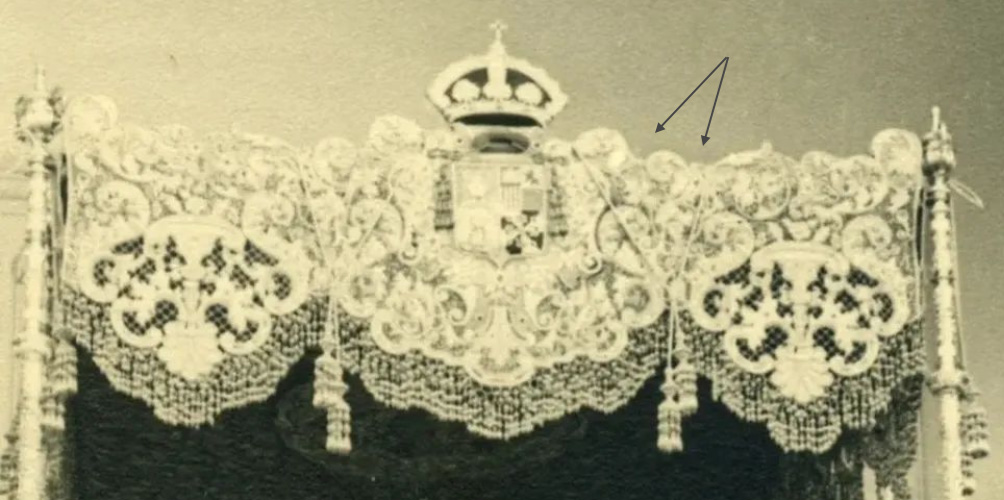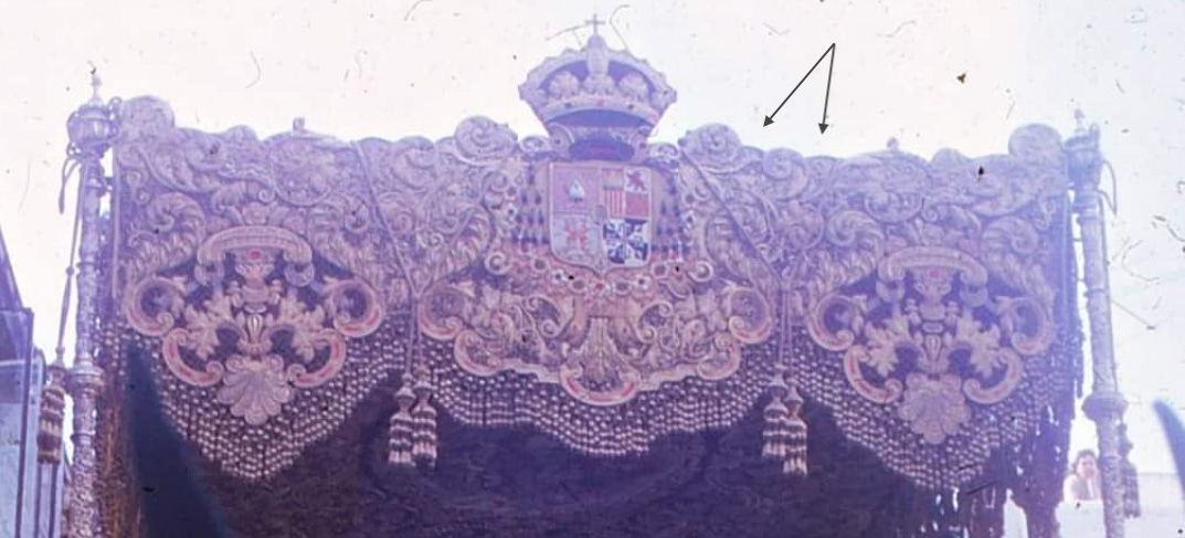 El deterioro actual de la pieza, así como nuestro compromiso férreo por la conservación del patrimonio, nos lleva a plantear la reproducción de este, teniendo en cuenta los aspectos que procedemos a detallar. En cuanto al soporte, se reproducirá la malla actual cuajada de lentejuelas y se recuperará la malla inferior de las bambalinas, de 1942, aportando mayor rotundidad y airosidad al diseño ornamental en su conjunto. En cuanto a los bordados, se planteará la posibilidad del enriquecimiento del mismo en cuanto a técnicas, en especial al bordado interior de las bambalinas, siempre y cuando no suponga mayor rigidez en el movimiento de estas.